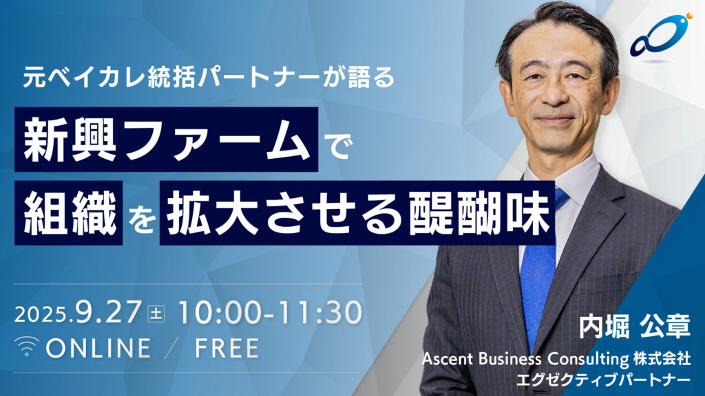 Ascent Business Consulting株式会社は、9/27(土)の午前10時より、オンラインにてコンサルタントの方向けのキャリアイベント「元ベイカレ統括パートナーが語る 新興ファームで組織を拡大させる醍醐味とは?」を開催します。